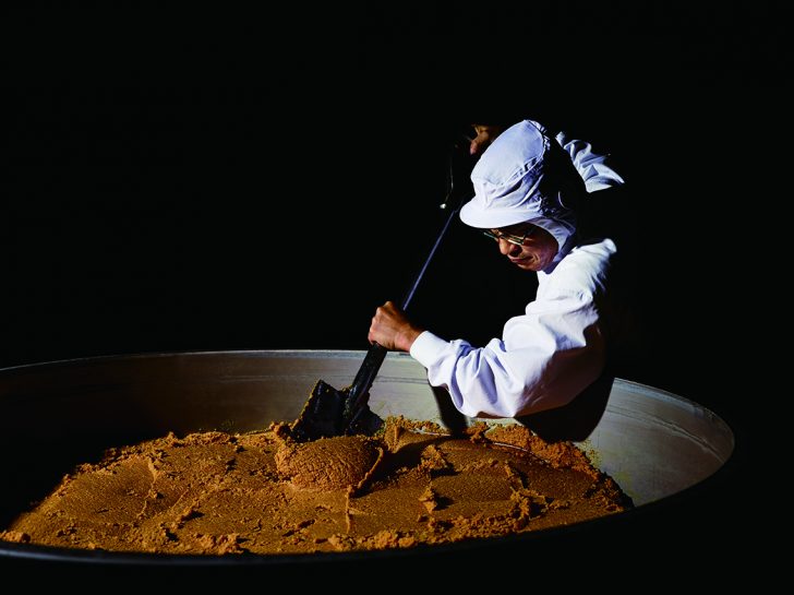 Loaded with healthy vitamins, minerals, fiber and plant protein, soybeans are the premier ingredient in miso. The soybean is a rather miraculous plant, able to synthesize nitrogen from the air to create protein. The Aspergillus oryzae mold culture, koji, develops over steamed rice, barely or soybeans, thus activating the fermentation process. As a matter of fact, yellow koji, that specifically used in the making of miso, is considered the National Mold of Japan! The enzymes produced in this process help to break down soy protein into peptides and amino acids, and the carbohydrates into glucose: the essential fuel for every cell in the human body. Salt is not only used for flavor, but it also functions as a natural preservative. Because of this, miso is one of Japan’s non-perishable foods. Finally, water is the last essential ingredient. Once these elements are melded together, the maturing process gets underway.