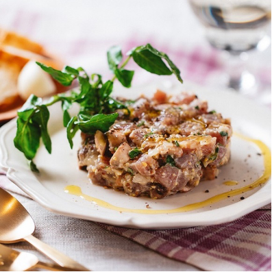 It is easy and fun to dress miso-infused tuna tartare and mushrooms; it can be enjoyed with a baguette or a nice wine. The sauce is made of miso, olive oil, grain mustard, Italian parsley and pepper. This sauce is also delicious served with sautéed salmon.
